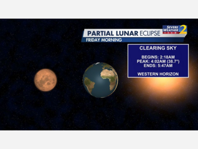 Patchy rain nearby, with a high of 53 and low of 26 degrees. Sunny during the morning, clear in the afternoon and evening, patchy rain nearby overnight.